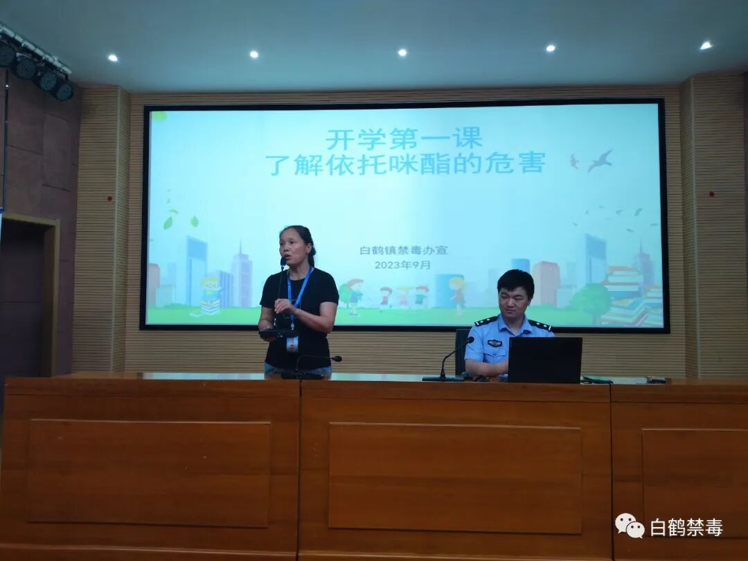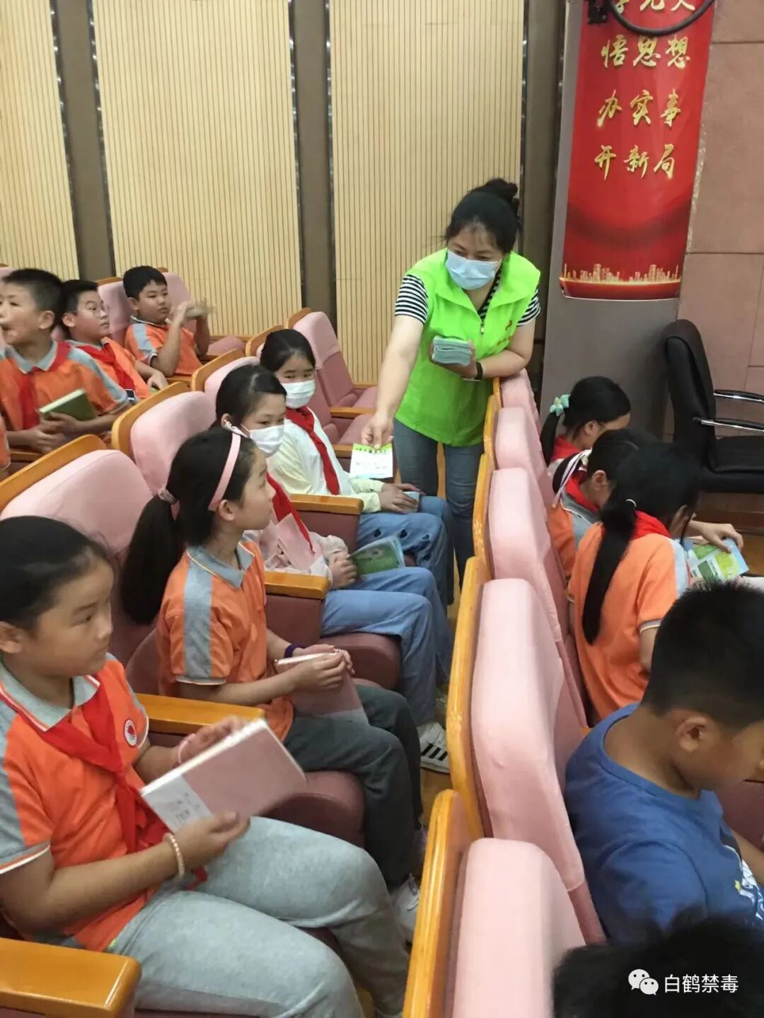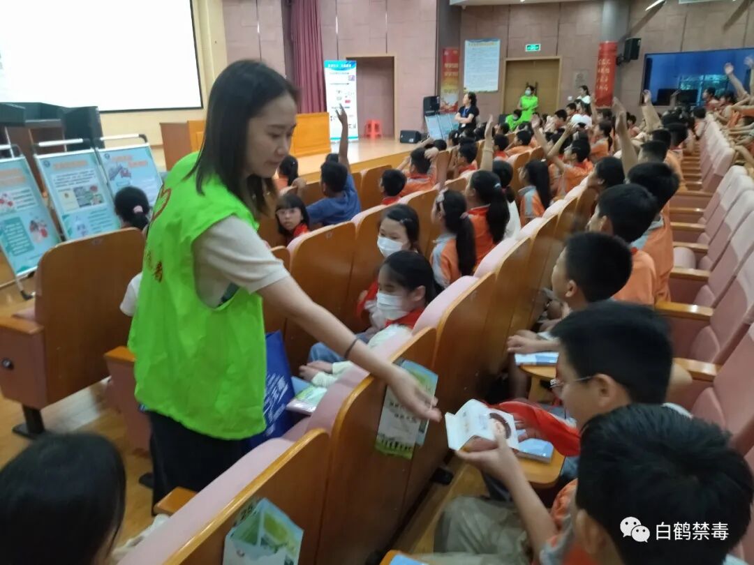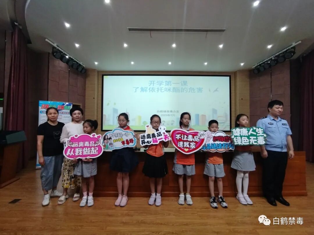 为了积极营造校园禁毒宣传教育氛围,引导在校青少年学生切实提升识毒、防毒、拒毒的意识和能力,养成积极向上的世界观、人生观、价值观。9月6日下午一点,白鹤镇禁毒办邀请夏阳戒毒所民警携禁毒社工和禁毒志愿者一起走进了白鹤小学,利用新生开学之际,开展警惕新型毒品“依托咪酯”,禁毒宣传进校园活动。