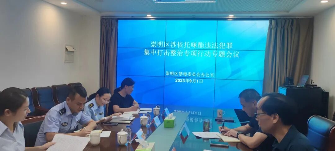 为有效遏制涉依托咪酯的非法制贩、滥用趋势,近日,崇明区禁毒办会同区公安分局、区卫健委、区市场局、崇明烟草专卖等部门,召开涉依托咪酯违法犯罪集中打击整治专题会议。会上,区禁毒办解读了区专项行动方案的主要内容,组织观看涉依托咪酯违法犯罪典型案例,各与会单位分析了前期排查涉依托咪酯相关情况,根据职能提出了下阶段工作打算。