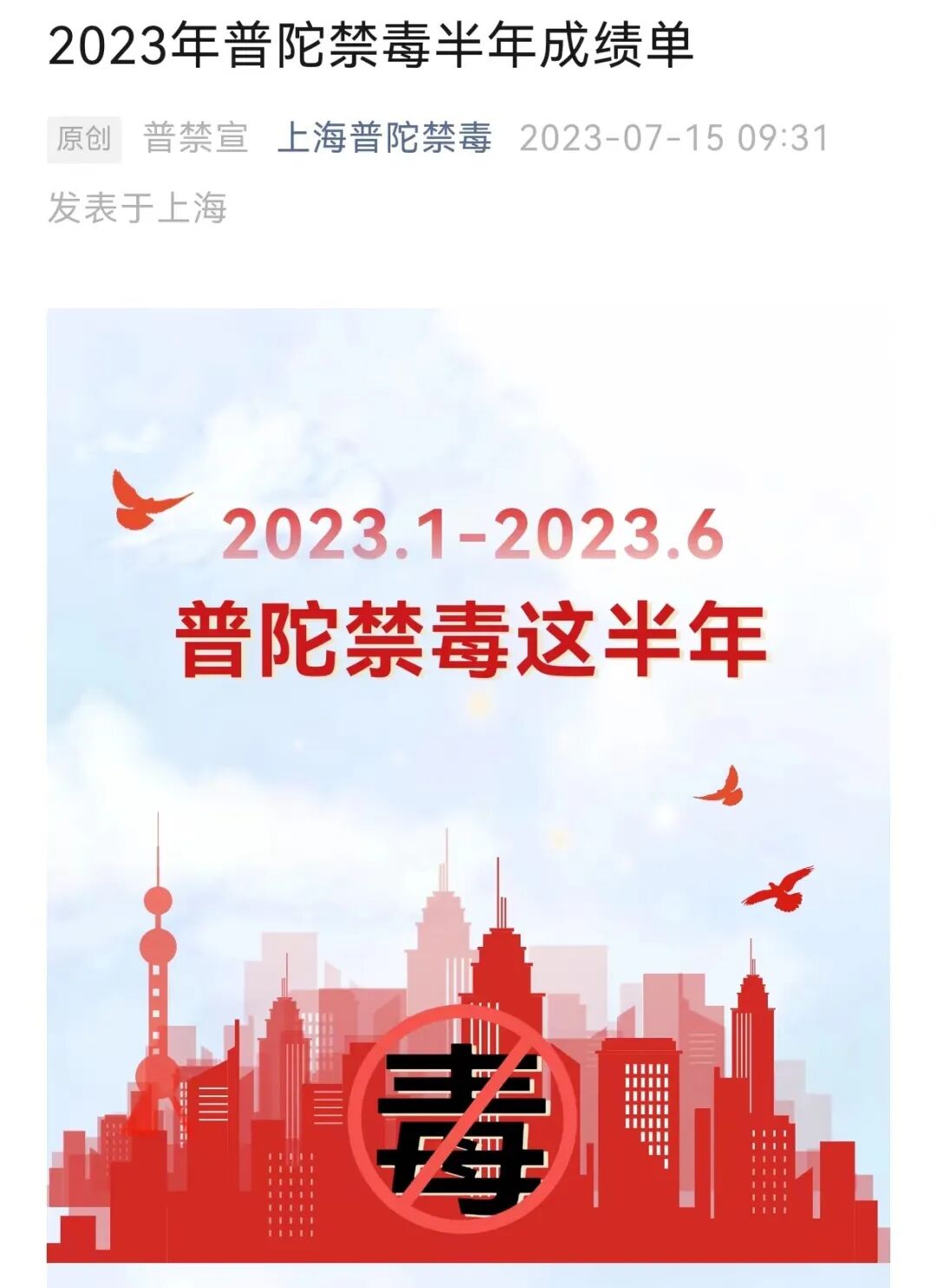 正式出推文,更是各方关注,仅预览的阅读量就达到200-300次。最终,普禁宣的“首推文”《2023年普陀禁毒半年成绩单》达到1110的阅读量,截至目前仍列本公众号阅读数前列。