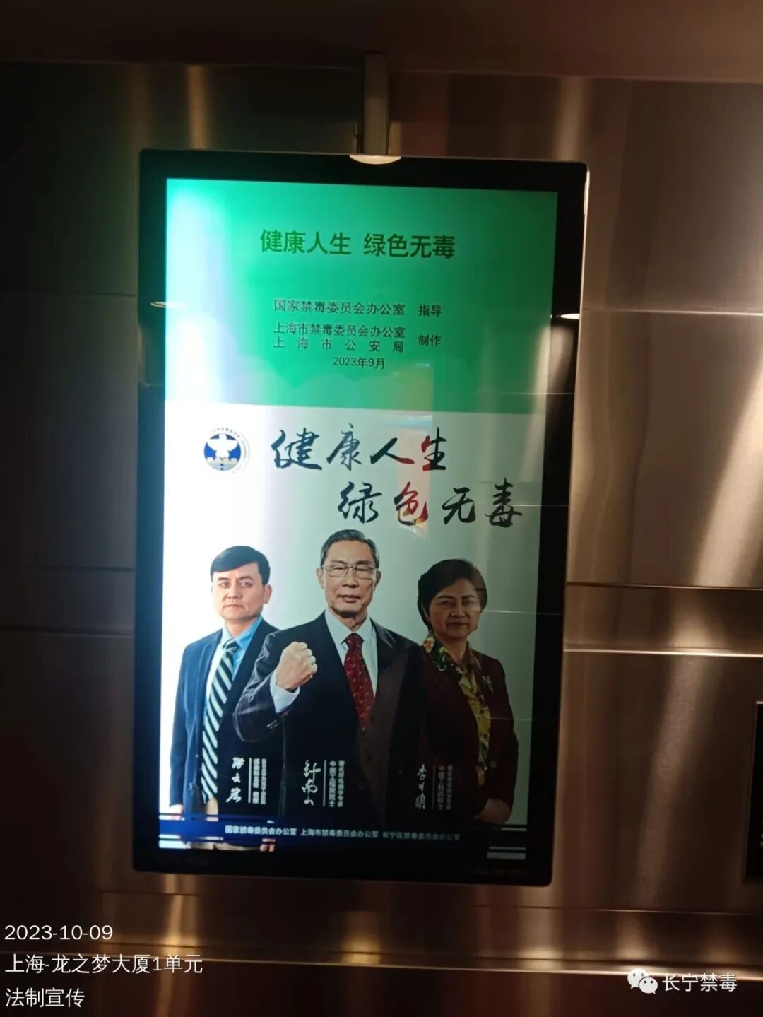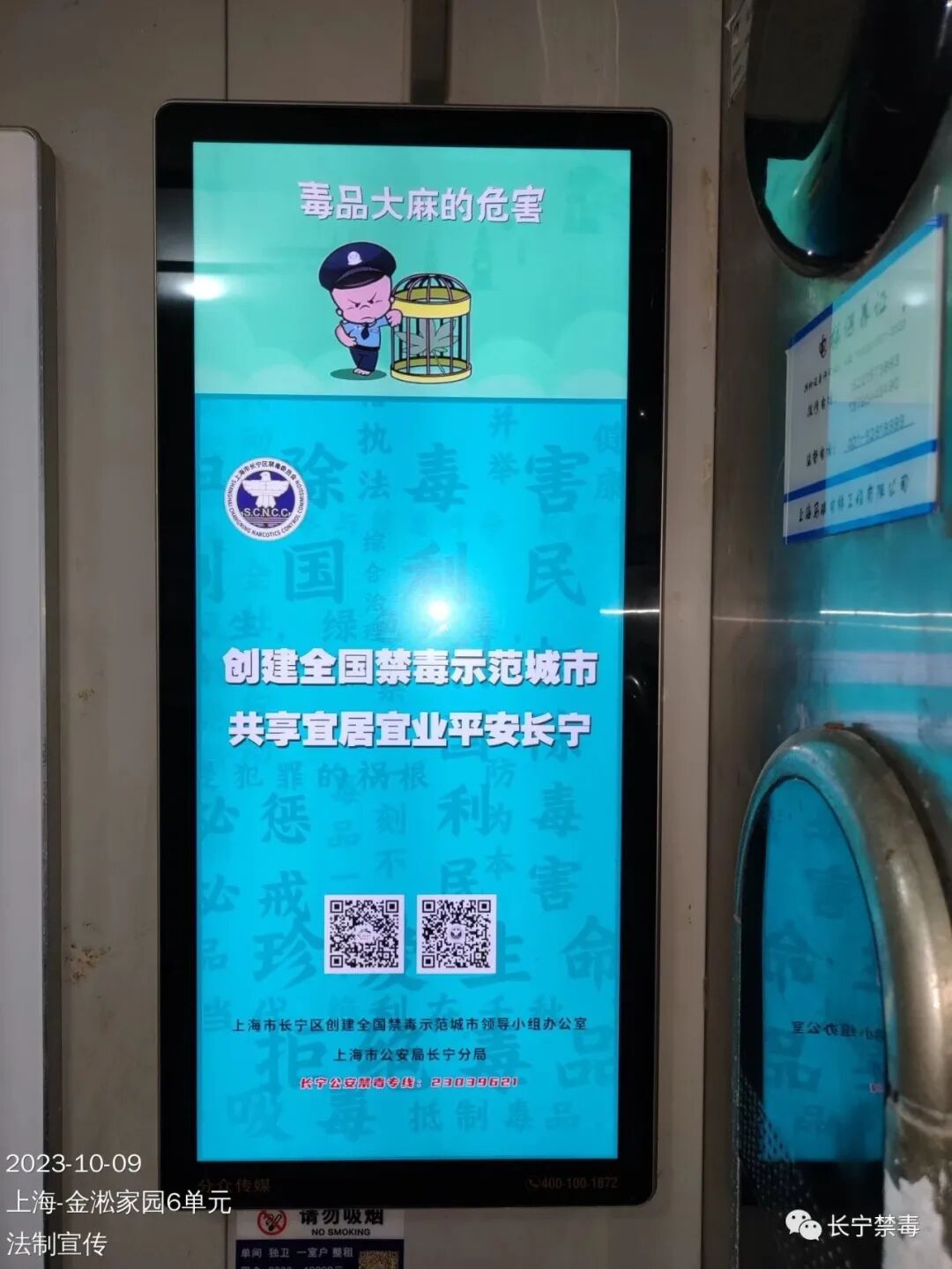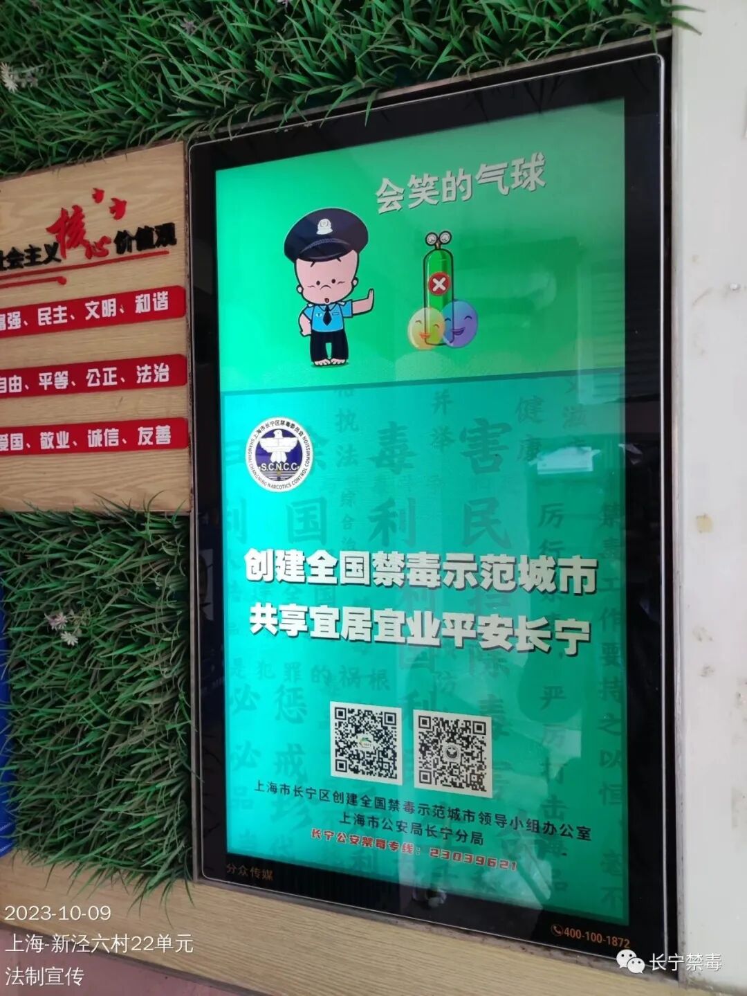 2023年10月9日-10月15日期间, “杜绝新型毒品”“毒品大变身”“网红药”“毒品大麻的危害”“会笑的气球”等5部小破孩禁毒宣传片和禁毒宣传海报将在长宁区内1500块宣传显示屏滚动放映,每天播放数百次。