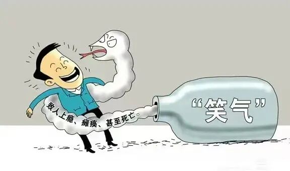 吸食“笑气”后,血液的氧饱和度会迅速下降,导致出现因缺氧而产生的头晕、胸闷、肢体不受控制等一系列症状。由于快感持续时间很短,吸食者经常会反复吸入,进一步增加了缺氧窒息的风险。大量吸入“笑气”后会产生致幻、谵妄、神志错乱、视听功能障碍和肌肉收缩能力降低等一系列副作用。短期吸食“笑气”,身体对其反应小,但吸食者也有舒适感,极易形成心理依赖,但后期由于耐受的形成,长期大剂量的吸食,将对身体产生不可逆的损害。