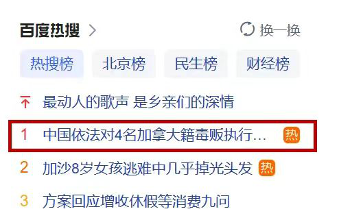3月20日下午,话题“中国依法对4名加拿大籍毒贩执行死刑”占据百度热搜榜第一位。