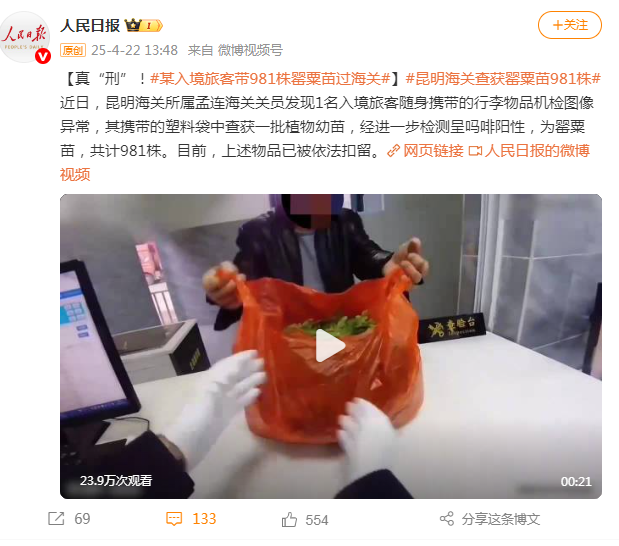 真“刑”!某入境游客带981株罂粟苗过海关......