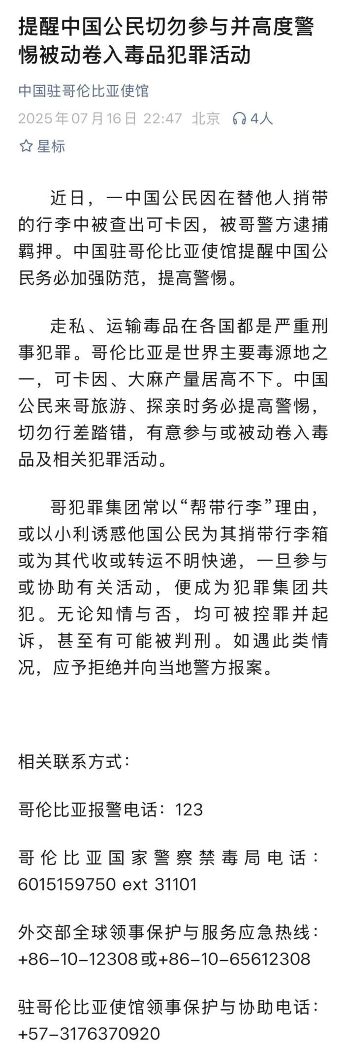 据中国驻哥伦比亚使馆官方微信消息,近日,一中国公民因在替他人捎带的行李中被查出可卡因,被哥警方逮捕羁押。中国驻哥伦比亚使馆提醒中国公民务必加强防范,提高警惕。