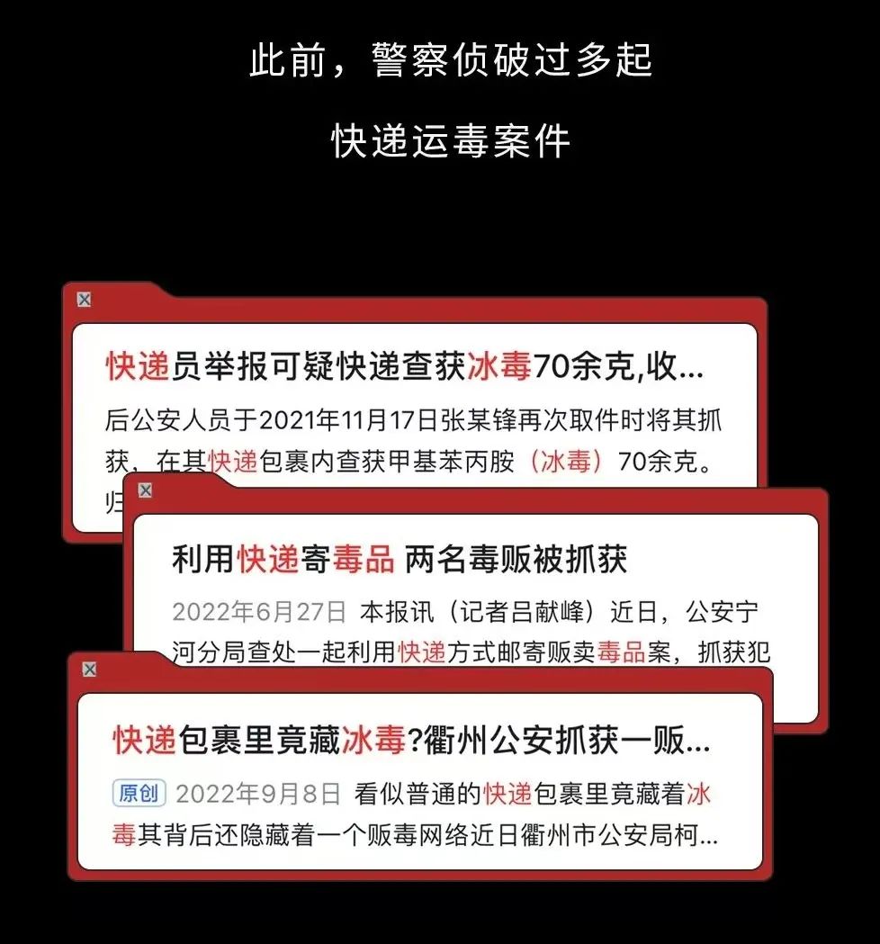 你几乎没有防备的承接了看似与往常无二的单子,但你却不知道你已经成为了毒品的运送者。此前,警察侦查过多起快递运毒案件,涉毒犯罪分子利用快递柜、代收、代发点这些途径寄送毒品,地址姓名、身份证号都是虚构的。而且商品都被精心伪装成食品、药品、儿童衣服这些普通物品,快递员很少拆开验货,即使拆开验可能也验不出来,如果你有个快递员朋友,请提醒他注意一下。