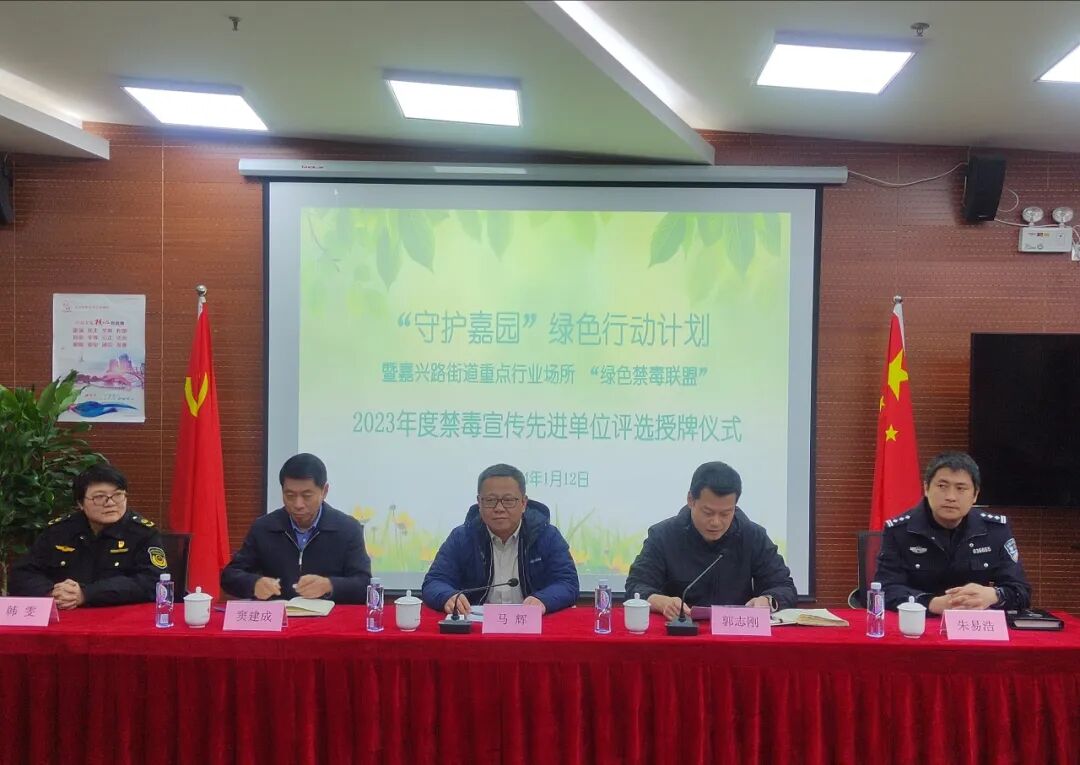 2024年1月12日下午,虹口区嘉兴路街道举办“守护嘉园”——重点行业场所“绿色禁毒联盟”2023年度禁毒宣传先进单位表彰仪式。