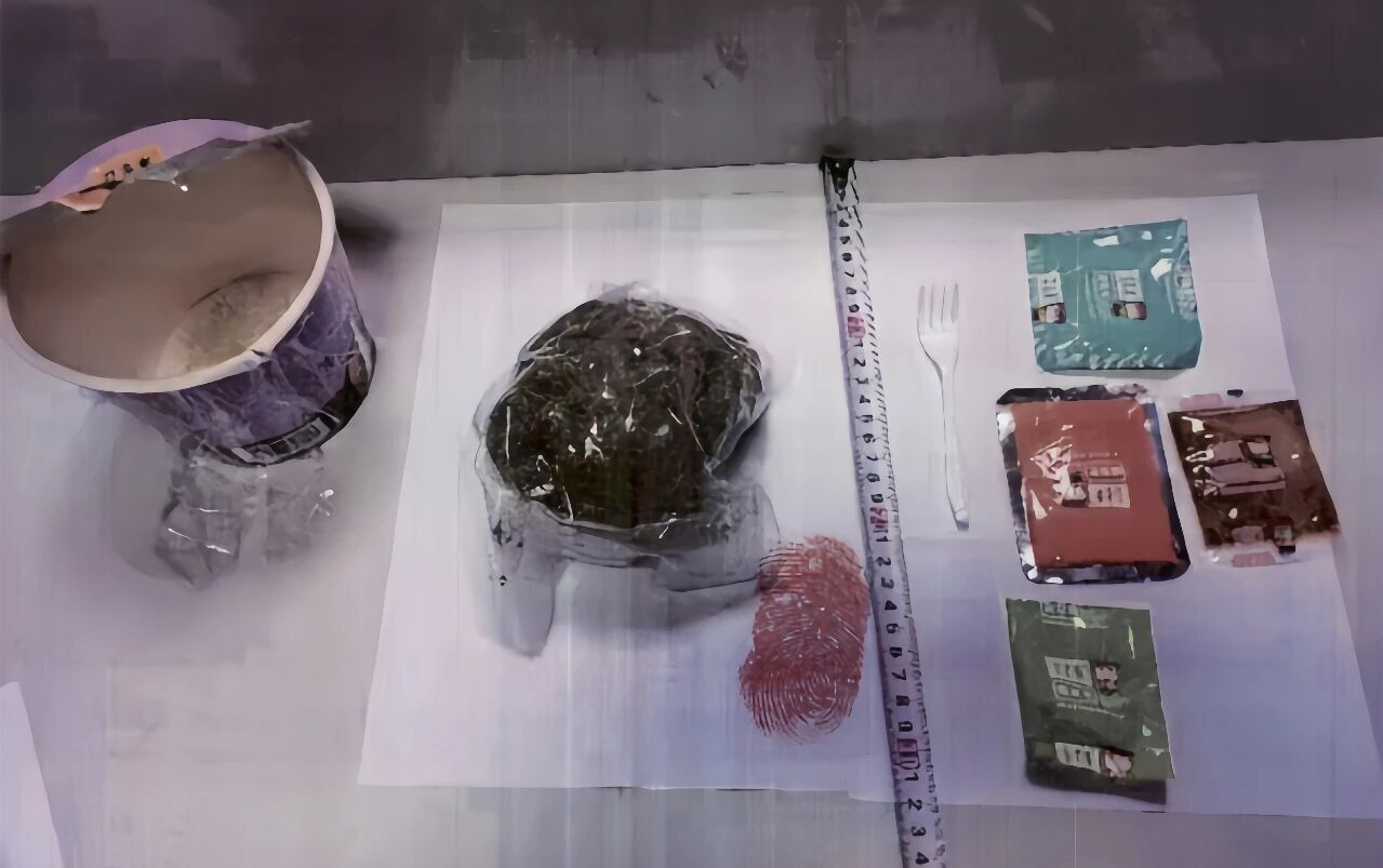 侦查机关查获的装大麻的米线盒,左侧为真空塑封大麻,右侧为大麻上做掩盖的调料包。